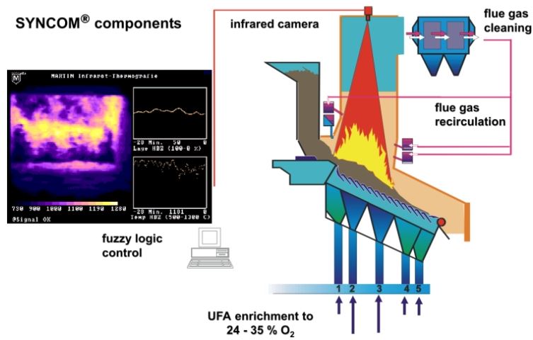 Flue gas recirculation and, above all, oxygen enrichment of the primary air substantially reduce the flue gas flow. This results in cost savings as smaller components can be used in the steam boiler and flue gas cleaning system. Also, pollution burdens at the stack are significantly reduced.