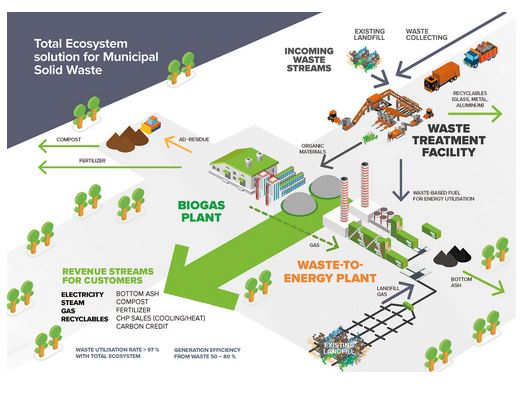The greatest benefit of the ecosystem is in these markets, where separate collection of waste is not yet widely practiced. Instead of landfilling, the ecosystem solution makes it possible to separate and treat different waste streams in the most appropriate way. The final products are energy, recycled products, fertilizers and soil improvers.