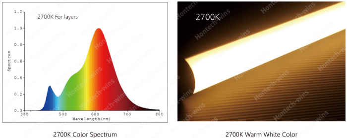 This light spectrum is Hontech-wins specially designed for layers. Hontech LED chips 2700K/Full spectrum producing by combining a red LED with blue and green phosphors.