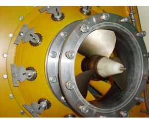 Propeller turbines, used in the Wave Dragon, have been used for more than hundred years in traditional hydro power plants. They are characterised by being extremely reliable and have very low maintenance costs. A propeller turbine is basically a traditional propel as shown on this picture of the Wave Dragon test turbine. This turbine has a 34 cm diameter runner designed by VeteranKaft AB and produced by Technical University of Munich. This turbine has been thoroughly tested at the university turbine test stand over a 3 years period. The test turbine has a siphon water inlet.