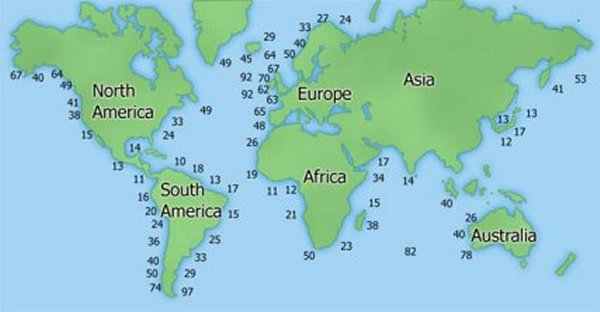 The energy potential in waves differs widely around the world. Normally wave energy is measured in kW/m, i.e. kW pr. meter wave. The following map illustration roughly depicts the average energy in ocean waves.