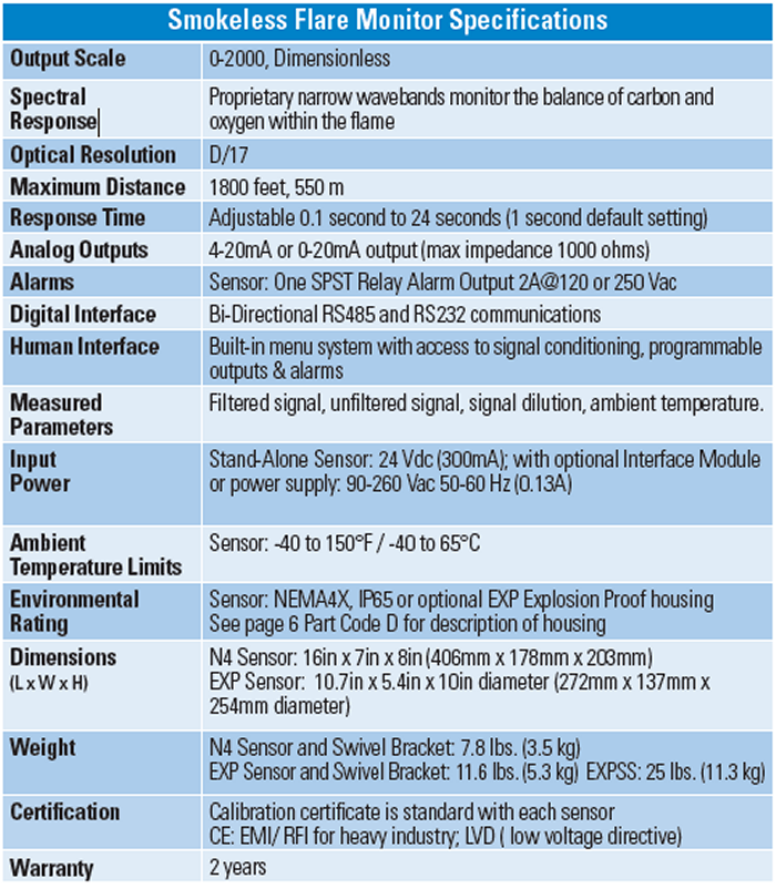 The Williamson Smokeless Flare Monitor (FM) utilizes proven dual-wavelength technology to monitor the ratio of carbon to available oxygen deep within the hot flare flame. This ratio value correlates to combustion efficiency and is used to adjust the flow of air or steam to smokeless flares, thus assuring smoke-free operation and maximum combustion efficiency.