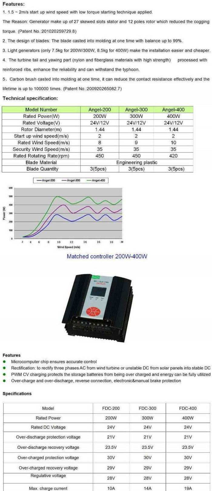 Angel 200W-400W small wind turbine with magnetic saturation patent technology. Its easy to install, and generator is small volume onty weight of 7-8.5kg. this weight is hart ol other same power product. Low start up wind speed, only 2nvs. and low rated wind speed design only 7—8m/s.