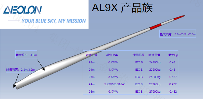 The AL98C1 wind turbine blade by Aeolon is engineered for high-performance energy generation applications. With a blade length of 98 meters and fitting into the IEC S design class, it is a considerable component in large-scale wind turbine systems. The blade features a maximum chord length of 4.8 meters and a pre-bending of 6.5 meters for enhanced aerodynamic efficiency. Manufactured using E/H-glass reinforced epoxy, it promises a design operational life of 20 years, highlighting robustness and longevity in demanding environments. The rotor diameter associated with this blade is 200 meters, and it operates within a speed range of 5 to 10.5 rpm, achieving a rated tip speed of 98.08 m/s and a rated rotor speed of 9.4 rpm. It features a power control system that is pitchable and variable-speed, ensuring optimal performance under various wind conditions. The blade supports an optimal tip speed ratio of 12.1 and performs at a coefficient of 0.464 at its optimal TSR. The insert principle used for blade connection, with a bolt hole circle diameter of 2800mm and 112 tension bolts, emphasizes secure and stable installation.