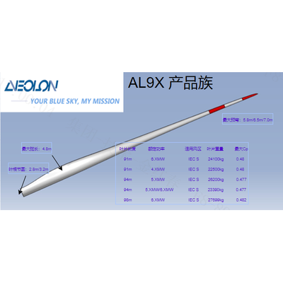 The AL94C2 wind turbine blade is engineered to meet the rigorous demands of modern wind power generation. With a length of 94 meters, it adheres to the IEC S design type class and features a maximum chord length of 4.8 meters. The blade's technical specifications include a pre-bending of 6.5 meters and a mass without T-bolt of 21.8 tonnes. Integrating E/H-glass reinforced epoxy materials, it boasts a design operational life of 20 years. It fits into a 193-meter diameter rotor, typically operating between 5 to 10.1 RPM. Designed to handle rated powers of up to 6.X MW, it features pitchable and variable-speed power control systems. With a rated tip speed of 90.31 m/s and an optimal tip speed ratio of 11.7, the blade achieves a performance coefficient of 0.474 at optimal TSR. The blade connection is secured using 112 M36X4.0 10.9 tension bolts over a bolt hole circle diameter of 2800 mm.