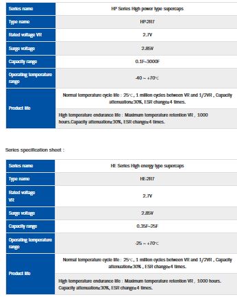 The performance of 2.7V winding type series supercapacitor . High energy, high power series. The capacity of 2.7V winding type series supercapacitor is from 0.1F to 3000F. Thus, the applied fields of 2.7V supercapacitor applications are very extensive. SE/HE series Kamcap super capacitor products use a temperature range of -25 ℃ ~ 70 ℃ low leakage, suitable for long-term continuous discharge of small current. SP/HP/LR seires kamcap super capacitor products use a temperature range of -40 ℃ ~ 70 ℃ low internal resistance, providing instantaneous high current output.