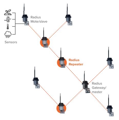 The Radius Gateway uses unlicensed wireless spectrum to seamlessly connect SDIâ€12 sensors attached to a Radius Mote over long distances—up to 15 km (9.3 miles), and up to 60 km (31 miles) using Radius Repeaters. The Gateway is the central hub of a Radius network. Radius networks incorporate advanced low power, long range wireless technologies with proprietary mechanical engineering, power management and power supply to eliminate the need for expensive supporting infrastructure (large batteries, solar panels, enclosures, cables). By eliminating this infrastructure as well as the need for a data logger and communications uplink at each sensor site, the cost of the entire sensor network is reduced dramatically.