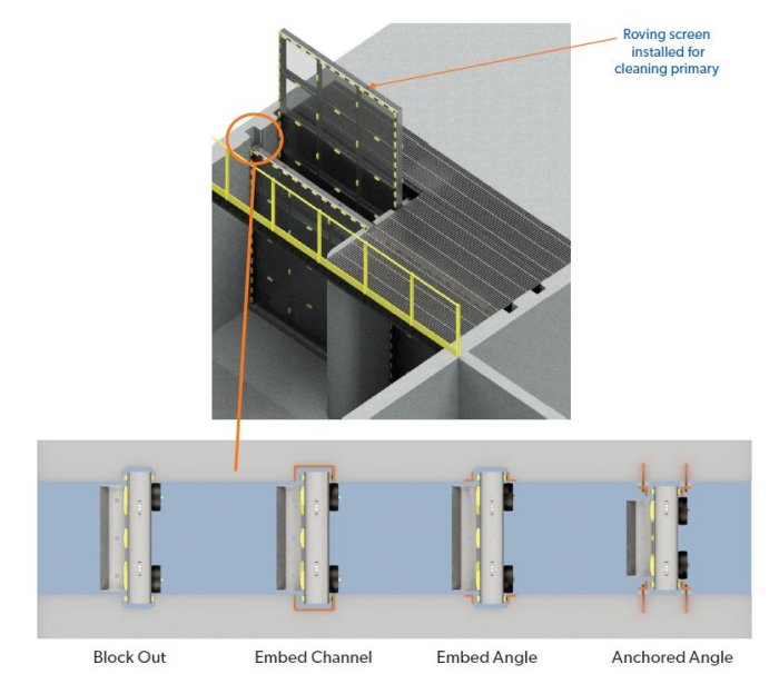 Stationary Screens are typically used in series with a primary screen facing the flow. A Roving screen is placed downstream to capture debris when the primary screen is fouled and requires cleaning. Stationary Screens can be sized for new construction or adapted to existing sites, including the guides.