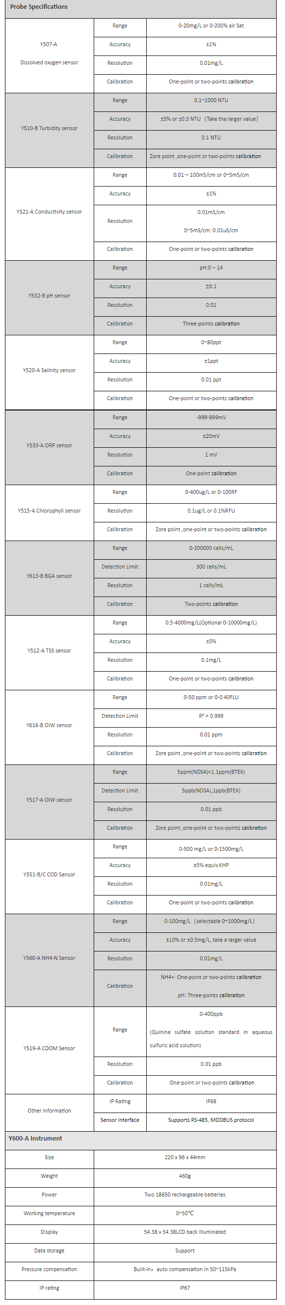 The Y600-A instrument is independently developed by Yosemitech. It provides keyboard and backlight with comprehensive functions, simple operation and brief interface. The instrument is  a portable  device  that can automatically recognize Yosemite`s digital sensors including optical dissolved oxygen, 4-electronic conductivity, turbidity, chlorophyll, BGA, OIW and TSS ,and can measure, display, log. The microprocessor based meter can transmit USB signals and perform sensor calibration easily on a single platform.