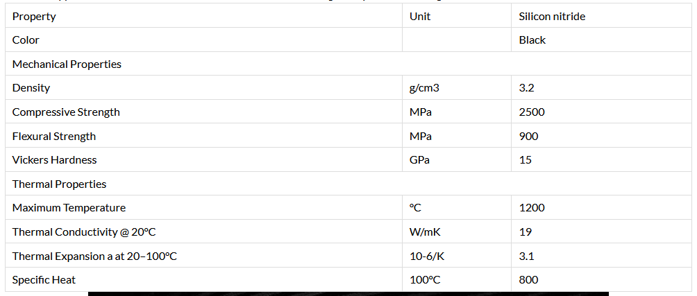 Silicon Nitride (Si3N4) has the most versatile combination of mechanical, thermal, and electrical properties of any technical ceramic material. It is a high performance technical ceramic that is extremely hard and has exceptional thermal shock and impact resistance. It surpasses most metals high temperature capabilities and has a superior combination of creep and oxidation resistance. Additionally, its low thermal conductivity and high wear resistance make it an excellent material that can withstand the toughest of conditions in the most demanding industrial applications. Silicon Nitride is an excellent choice when high-temperature and high-load abilities are needed.