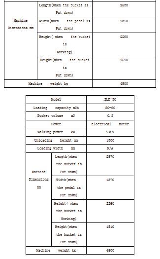 Loading capacity m3h 30-40. Bucket volume m3 0.2. Power Electrical motor. Walking power kW 9×2. Unloading height mm 1360. Loading width mm N/A.