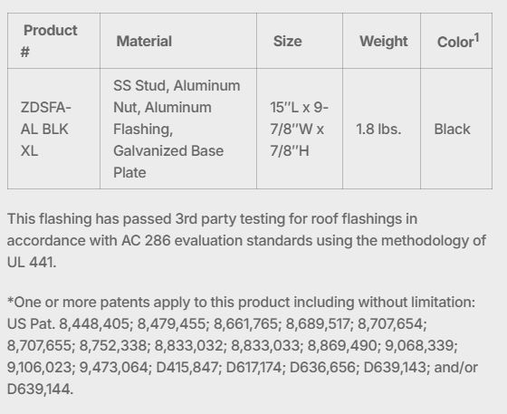 - Passed 3rd party testing for roof flashings in accordance with AC 286 evaluation standards using the methodology of UL 441.