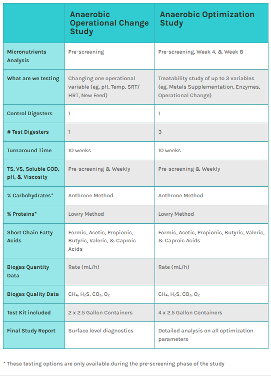 The Anaerobic Operational Change Study is designed to accurately predict the impact of a specific operational change to an anaerobic digester. This 10 week study includes a comprehensive prescreening for metals, TS, VS, pH, soluble COD, Anthrone, Lowry, and SCFA’s (short chain fatty acids). Each testing package will include site specific observations on digester performance.