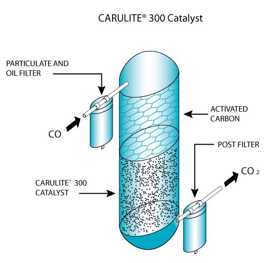Compressed air is pre-filtered and passed through a desiccant dryer where water vapor is removed to a -40°C dew point. Activated carbon or other media is then used to remove oils and other volatile organic compounds, prior to contact with the catalyst bed. The dry treated air is passed through the CARULITE 300 catalyst to convert the carbon monoxide to carbon dioxide. The air is then passed through a post-filter to produce breathing quality air.