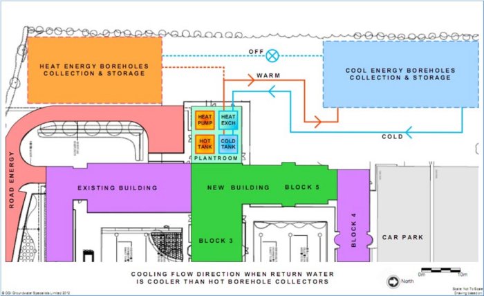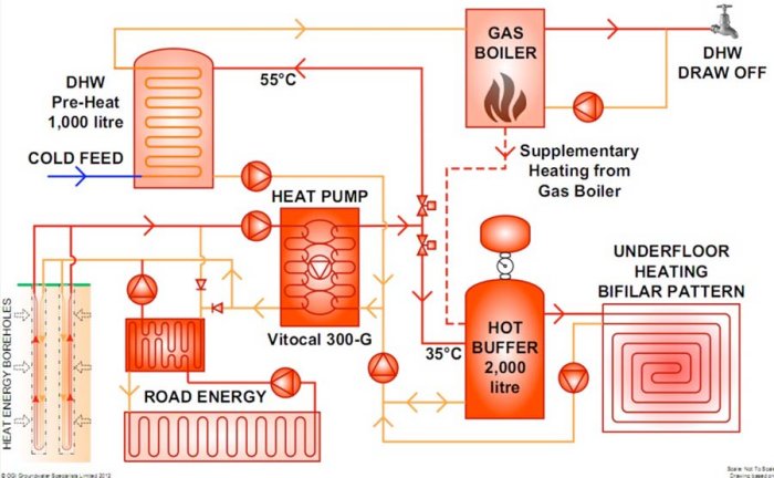 OGI is able to provide detailed Performance Specifications for Clients who wish to include a Ground Source Heat Pump (GSHP) system to provide their heating, cooling and domestic hot water. OGI will take the Clients general annual heating requirements and will determine heat pump and ground collector performance requirements to achieve these requirements.OGI will then produce a conceptual design covering the type and space available for the ground collectors, glycol requirements, collector ground loop manifold requirements, and plant room equipment, to include heat pump sizing, buffer tank and calorifier sizing, temperature requirements, backup heating system requirements and interface, expansion vessel requirements, instrumentation requirements etc.