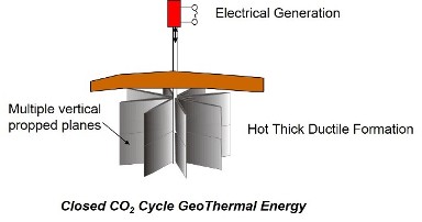 An alternative GeoThermal energy source is the hot ductile formations in sedimentary basins, that exist close to infrastructure in the USA. Highly permeable inclusions can be installed in these ductile formations by the injection of a non-invasive fluid and proppant, without giving rise to any potential induced seismicity. The system could be a single well with multiple azimuth propped vertical planes, or interconnected wells. In this latter case the geothermal wells are hydraulically connected by the highly permeable installed vertical planes. A closed cycle supercritical carbon dioxide loop is used as the thermal energy transfer medium for electrical power generation, The system has considerable advantages both economically and environmentally, especially its 24/7 electrical generation capability, close to infrastructure, and with construction and operation being minimally invasive and a small surface footprint.