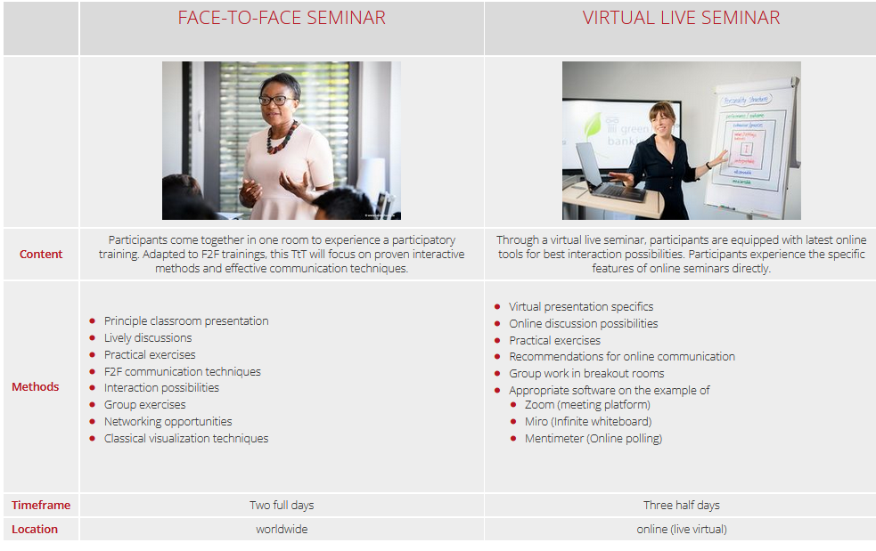 - Tailored learning concepts for face-to-face and/or virtual live seminars