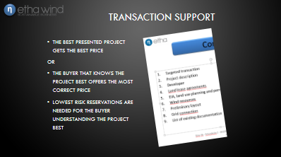As a logical continuation of wind farm design and permitting support comes transaction support. We have seen several wind farms succeeding (and failing) during the permitting process and we have hands on experience from all steps in the permitting process. Thus we are ideally positioned to support project evaluations, and perform due diligence.