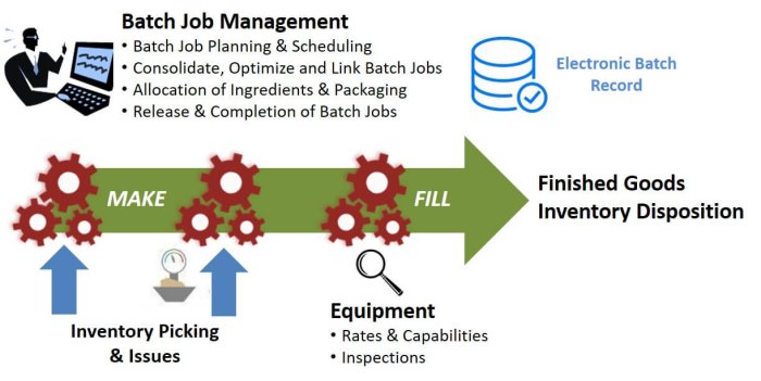 Streamline & Scale Up Batch Production System. BatchMaster’s Production Module manages all the mix, blend, fill, assemble, and other manufacturing processes required to produce one’s intermediates and finished goods, including co-products and by-products. In addition to supporting make-to-stock operations, custom blenders, private label, toll and contract manufacturers can take advantage of our application’s make-to-order features. From inventory appropriation to finished goods completion, all production and quality related transactions are captured and reported, including actual inventory usage, labor costs, and yields, during all steps in the batch manufacturing process