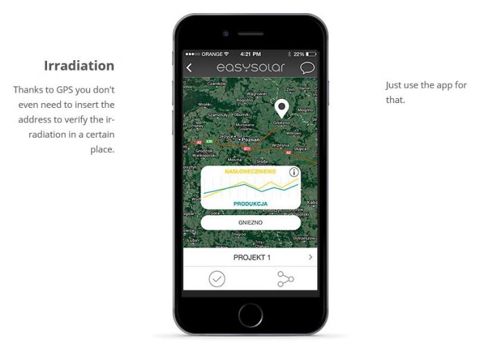 Thanks to GPS you don`t even need to insert the address to verify the irradiation in a certain place. Just use our app for that.