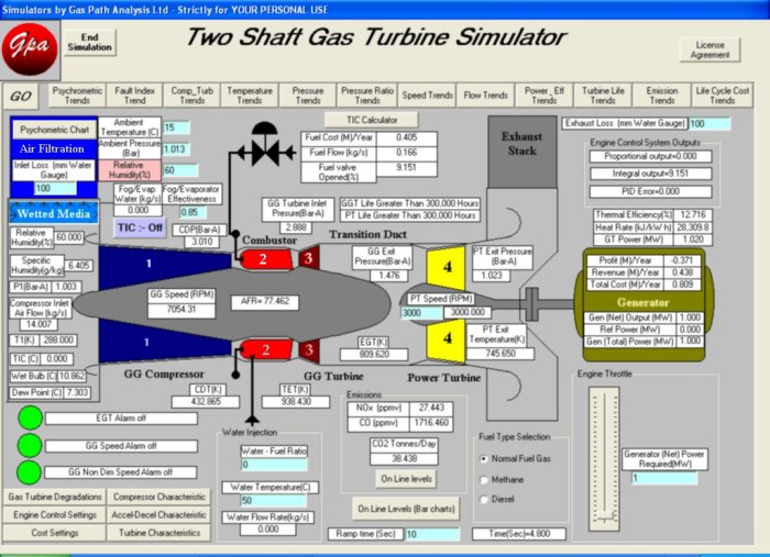 Unlike steady state simulations, which gives a static picture to the issues of gas turbine performance, these simulators bring in the additional dimension of time thus giving the user a realistic feel of the operation of the gas turbine in real time. GPAL simulators achieve this by extensively using full component matching and control system modeling (PID). Thus, factors that limit engine performance (e.g. EGT, speeds and power limits) at different ambient conditions and engine deterioration can readily be appreciated. The use parametric models (emissions monitoring) and Larson-Miller techniques (turbine creep life monitoring) in the simulators gives an excellent insight into gas turbine emissions and turbine creep life usage during engine operation.