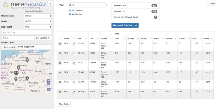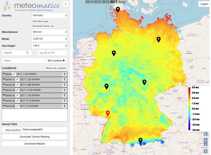 The new "Wind Market Value Analysis" is the necessary tool for making informed decisions on planning, marketing, operation and securing of wind turbines and wind farms. With its new product, Meteomatics combines high-resolution meteorological data with price information and analyses market values as well as additional and reduced revenues for Germany and other European countries. Therefore, you can choose from 24 plant manufacturers, their respective turbine types and the corresponding hub heights.