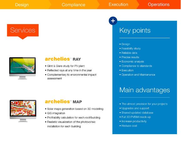 archelios suite helps you design the entirety of a photovoltaic installation project from the feasibility study, bankability, 3D design, to the compliance and calculation notes, right up to the operation and maintenance management, with the utmost precision. archelios™ suite is the most complete software solution for PV design. For the research departments, project developers and the installers, it is a significant progress allowing important productivity gains, and on the other hand to work on common data, from the technical and economic feasibility study, until the building details needed to the project engineering.