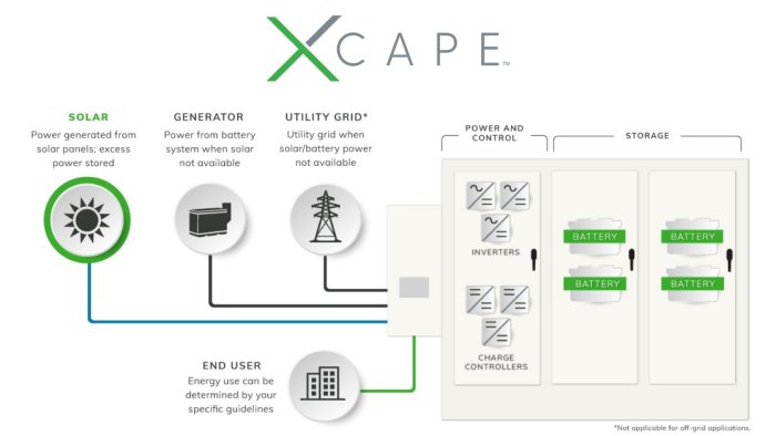 Xcape is a solar microgrid solution – operating on power generated from solar panels, storing excess energy in the battery system to optimize renewable energy utilization. When solar power is unavailable due to cloud cover or at night, Xcape uses power from the battery system or the grid, providing resilient power.