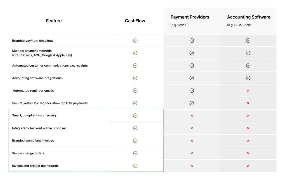 See how CashFlow compares to other solutions. Unlike generic payment providers or accounting software, CashFlow offers an all-in-one solution tailored specifically for solar professionals.