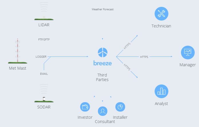 Wind resource monitoring system to manage wind measurement campaigns. Lower uncertainty with quality data. High quality wind data is the foundation for all wind energy projects. Wind resource assessment can be split into two different and important tasks: wind monitoring and wind analysis. Wind monitoring is a highly repetitive, though essential task, which can be a burden for over-qualified wind analysts. Multiple data formats from data loggers, LIDAR and SODAR are cumbersome to manage and compare. Sensor failures and missing data wait days before detection. Report writing and distribution consume valuable time. If not done adequately, the available data may not be of sufficient quality before the more sophisticated analysis begins. Breeze increases efficiencies by automating wind monitoring tasks and conveniently providing quality data and supporting documentation to the wind analyst.