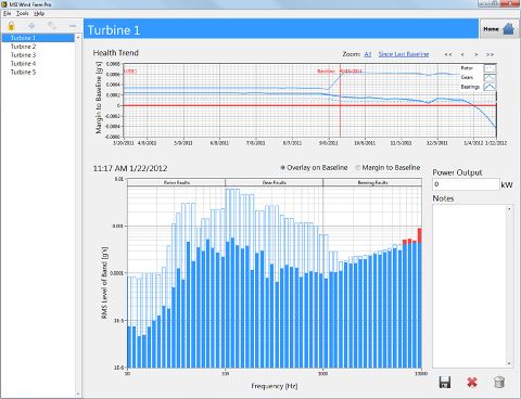 The MSI Wind Turbine Pro software provides a convenient interface to watch the evolution of measurements over time by dragging a cursor left or right along a time axis. The margin to baseline for each of the three fault types (rotor, gear, and bearing) is trended along the same time axis at the top of the window.