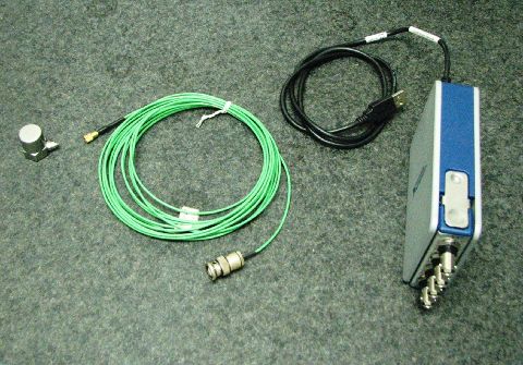 MSI Wind Turbine Pro uses an industry-standard accelerometer (left). It connects to an off-the-shelf USB chassis (such as provided by the National Instruments or by Sequoia, SPA) via a standard low noise coaxial cable (center). Not shown: A standard Windows based laptop and a magnetic base to attach the accelerometer to the wind turbine base.