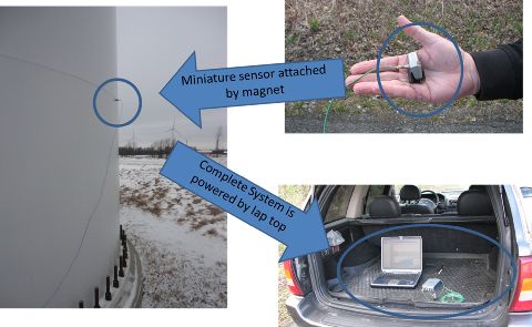 MSI Wind Turbine Pro is a portable, non-intrusive predictive health monitoring system for the wind power industry. The system includes software and USB-powered data acquisition hardware, and works with any standard Microsoft Windows laptop. Temporarily attach the magnetically-mounted accelerometer to the tower base, record a snapshot of data, and instantaneously view analysis results. No nacelle access needed. The system can be easily carried from turbine to turbine for periodic measurement and comparison.